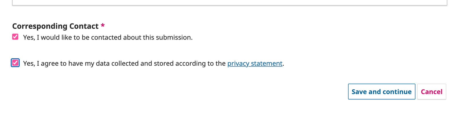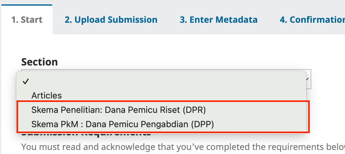 Klik tanda panah di bagian section, lalu muncul pilihan skema penelitian serta PkM. Silhakan pilih skema mana yang anda akan submit, setelah itu checklist semua (lewati saja "comment for editor") lalu checklist corresponding contact. Dan klik "save and continue"