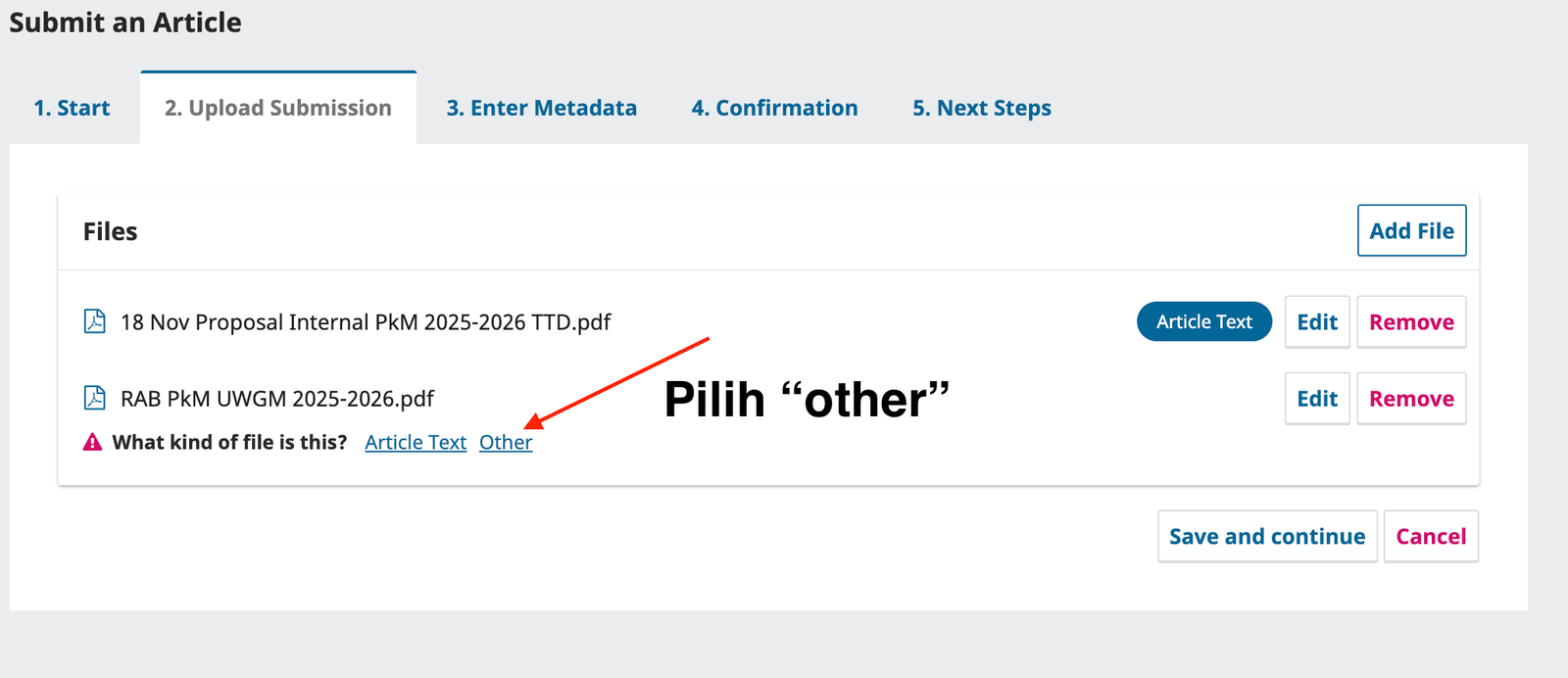 Kita masuk ke bagian upload file submit anda yang berupa proposal serta lampiran-lampiran nya. Silahkan klik "upload file" atau "Add file"