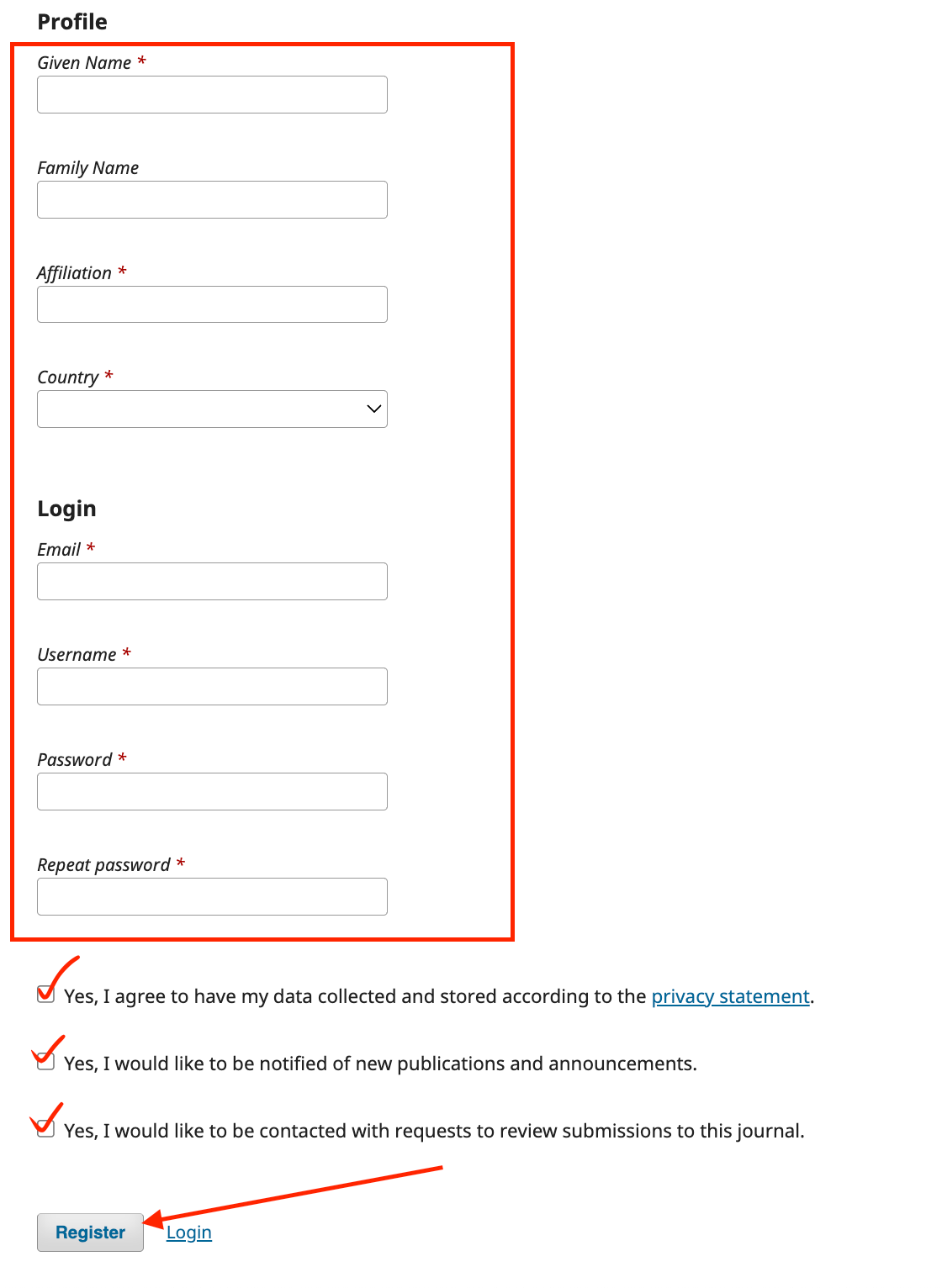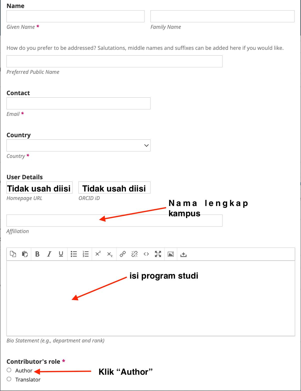 Lengkapi semua dan checklist lalu kllik register (mohon untuk affiliation jangan di singkat namun di tulis lengkap Universitas Widya Gama Mahakam Samarinda) jika muncul "reviewing interest" sebelum anda klik register silahkan isi sesuai kepakaran anda.